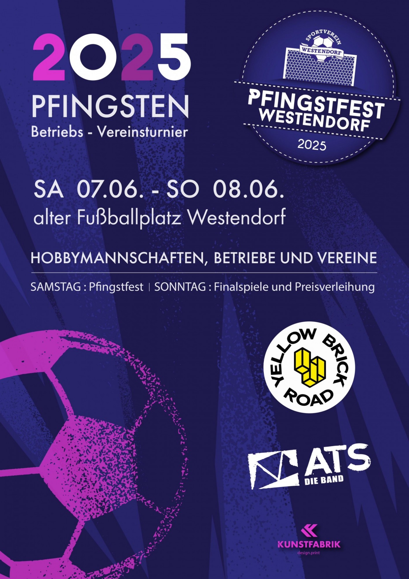 Während die Teams um den begehrten Pfingstturnier Wanderpokal kämpfen, ist für Fans, Cheerleader und Partygäste so einiges geboten. Mit Beerbong, Nagelstöcke und einiges mehr sorgen wir für ein Pfingstfest für Party- und Fußballbegeisterung.